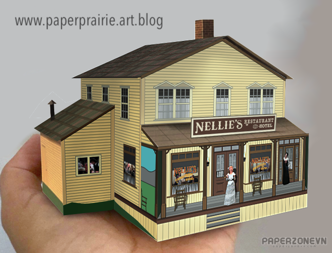 Nellie’s Restaurant represents the "high society" of Walnut Grove. Unlike the simple log cabins of the prairie, this building features two stories, elegant balconies, and large windows inviting guests for a fine meal. For fans of the series, this model is a centerpiece for any town diorama, symbolizing the rivalry and the contrasting lifestyles of the era. Download Nellie's Restaurant papercraft, Victorian building templates free, Walnut Grove hotel DIY, historical 3D models.